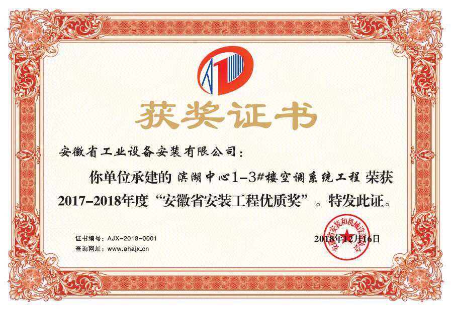 根據《中國安裝工程優(yōu)質獎(中國安裝之星)評選辦法》(安協〔2015〕19號)、《關于開展“2017-2018 年度中國安裝工程優(yōu)質獎(中國安裝之星)第一批評選活動”的通知》(安協〔2017〕7 號)要求,協會做為我省推薦單位,組織專家對七個申報中國安裝工程優(yōu)質獎項目,進行檢查驗收,一致認為,均代表我省安裝行業(yè)優(yōu)質水平。為表彰先進,樹立標桿,經研究決定授予安徽省工業(yè)設備安裝有限公司“濱湖中心1-3#樓空調系統工程”等七項工程榮獲2017-2018年度“安徽省安裝工程優(yōu)質獎”。并在協會第七屆三次理事(擴大)會議上通報表彰。協會希望各獲獎單位珍惜榮譽,再接再厲,繼續(xù)探索爭先創(chuàng)優(yōu)的經驗,充分發(fā)揮示范引領作用,各協會會員單位要以獲獎單位為榜樣,牢固樹立質量第一意識,多出精品,多創(chuàng)名品,為質量強省,提質優(yōu)效,轉型升級發(fā)展而努力。