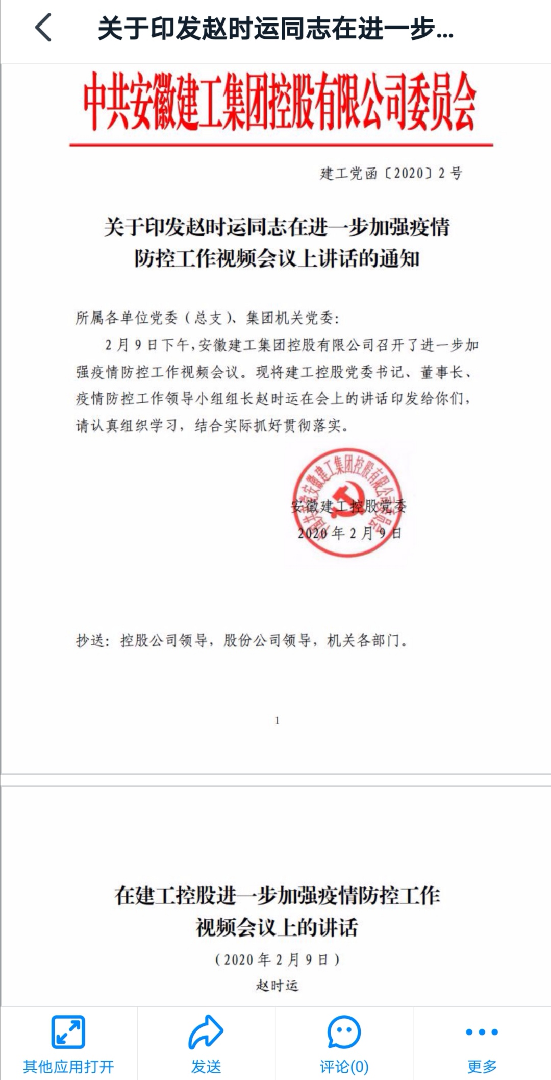 2月11日,安徽安裝公司通過釘釘日志、疫情防控群等網(wǎng)絡(luò)形式,迅速將《集團(tuán)公司黨委書記、董事長趙時運在進(jìn)一步加強(qiáng)疫情防控工作視頻會議上的講話》精神,傳達(dá)到每名職工,做到人人皆知,認(rèn)真加以貫徹落實。