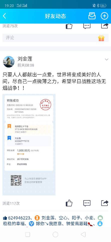 2020年2月13日,劉金蓮?fù)就ㄟ^微信轉(zhuǎn)賬的方式轉(zhuǎn)給甘肅省臨澤縣紅十字會(huì)捐款人民幣1000元,然后她又主動(dòng)聯(lián)系當(dāng)?shù)丶t十字會(huì)工作人員要求擔(dān)當(dāng)志愿者,但是因?yàn)榭陀^原因未被批準(zhǔn)。