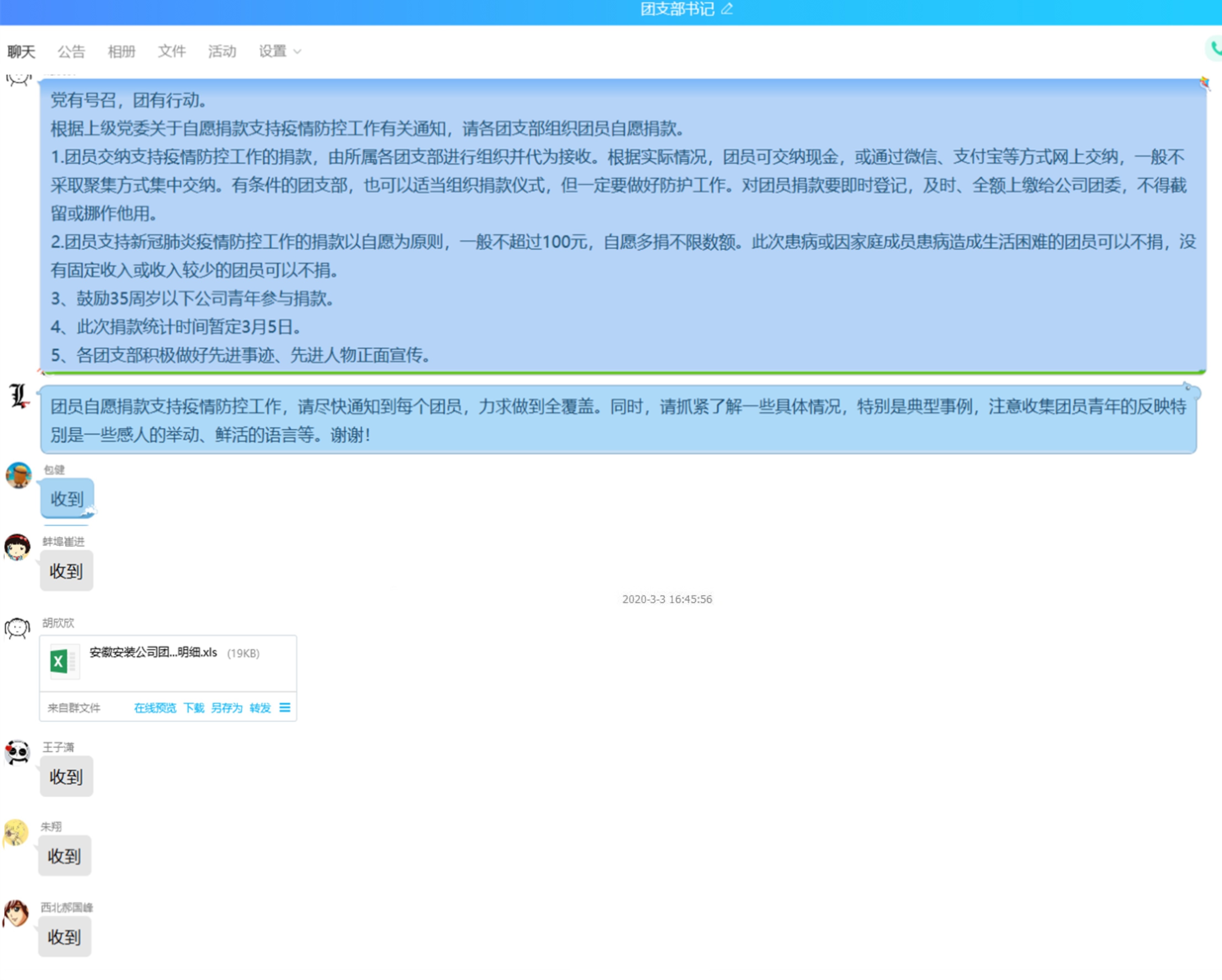 在這次疫情“抗戰(zhàn)”中,安徽安裝公司的團(tuán)員青年們在各自的崗位堅(jiān)守陣地,貢獻(xiàn)力量。各團(tuán)支部書記帶頭“作戰(zhàn)”,有的積極配合社區(qū)進(jìn)行防疫登記,有的堅(jiān)守崗位做好公司防疫消毒工作,有的在項(xiàng)目一線積極進(jìn)行防疫宣傳。各團(tuán)員青年充分發(fā)揮生力軍作用,機(jī)關(guān)團(tuán)支部徐君婷給社區(qū)捐獻(xiàn)了51個(gè)N95口罩,合肥團(tuán)支部陳濤濤、馮俊、蚌埠分公司團(tuán)支部王大旭等為公司想方設(shè)法采購防疫物資,西北分公司團(tuán)支部劉金蓮給當(dāng)?shù)丶t十字會捐款······他們以實(shí)際行動(dòng)亮身份樹形象, 當(dāng)好“戰(zhàn)斗員”,當(dāng)好“宣傳員”,助力身邊的疫情防控工作,依法科學(xué)有序參與疫情聯(lián)防聯(lián)控。