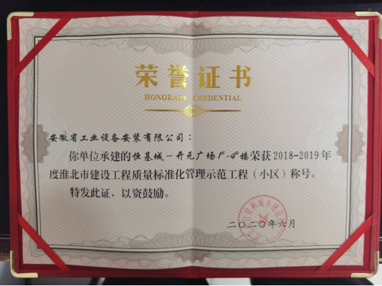 近日,安徽安裝公司承建的淮北恒基城開元廣場項(xiàng)目工程榮獲“2018--2019年度淮北市建設(shè)工程質(zhì)量標(biāo)準(zhǔn)化管理示范工程(小區(qū))”稱號。