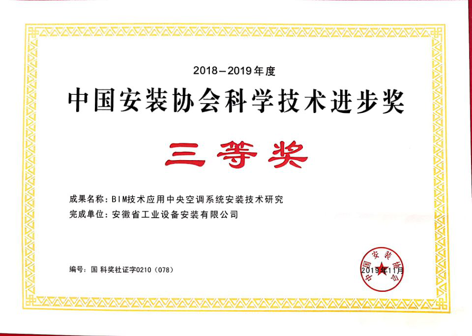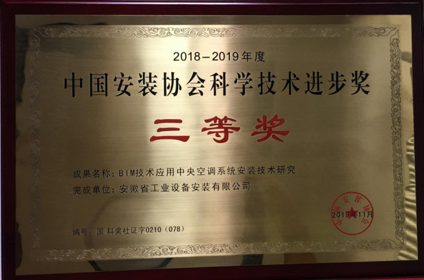 由安徽安裝公司主持研究的《BIM技術(shù)應(yīng)用中央空調(diào)系統(tǒng)安裝技術(shù)研究》項(xiàng)目榮獲“2018-2019中國(guó)安裝協(xié)會(huì)科學(xué)技術(shù)進(jìn)步獎(jiǎng)”三等獎(jiǎng)榮譽(yù)。受疫情影響,該獎(jiǎng)牌及證書(shū)于8月15日下發(fā)。
