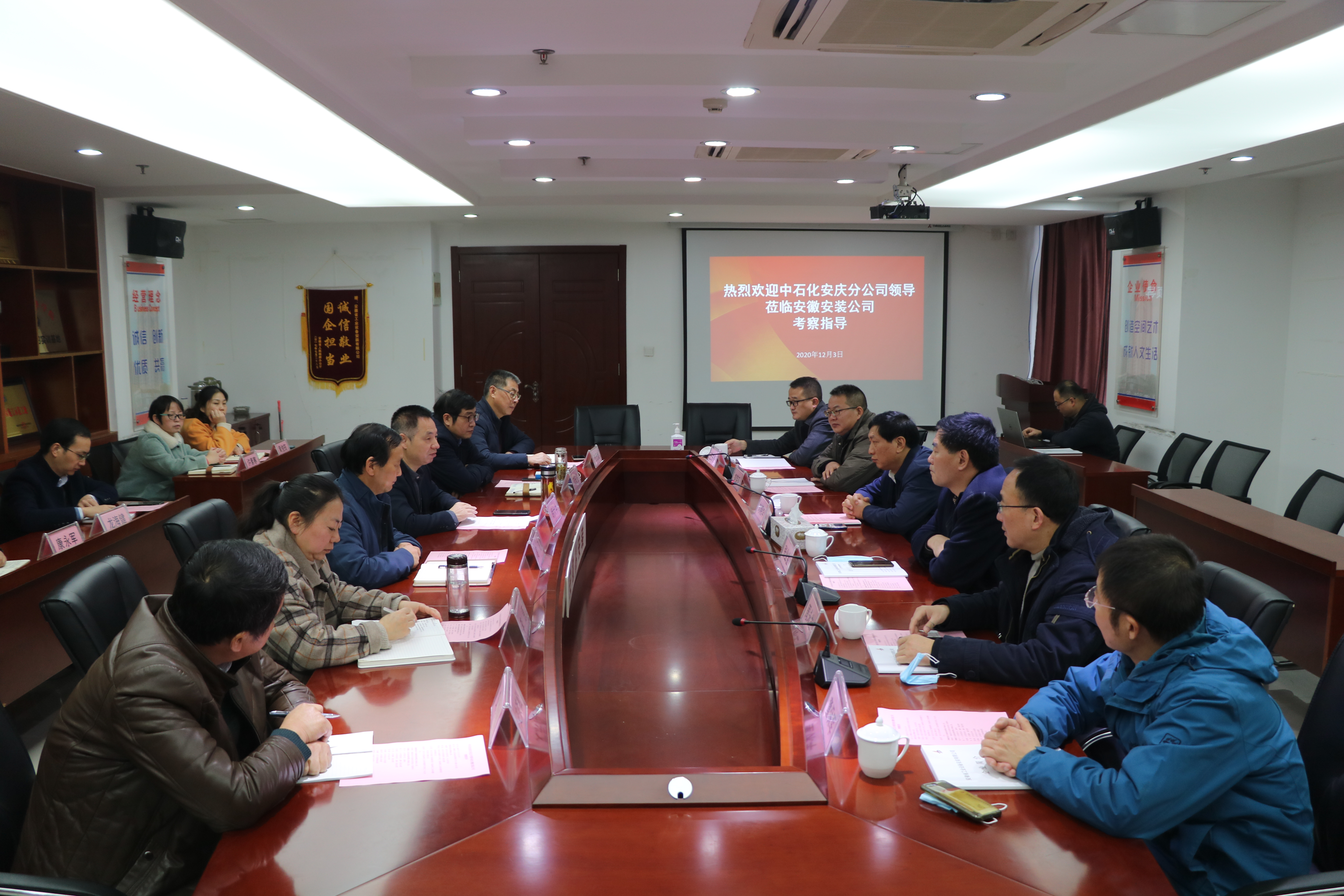 12月3日,中國(guó)石化安慶石化公司黨委書記、分公司代表劉曉華,中國(guó)石化安慶石化公司副總經(jīng)理張業(yè)金,安徽盈創(chuàng)石化檢修安裝有限公司董事長(zhǎng)胡榮昭一行赴安徽安裝公司考察指導(dǎo),并召開座談會(huì)。安徽安裝公司黨委書記、董事長(zhǎng)胡六中主持會(huì)議。