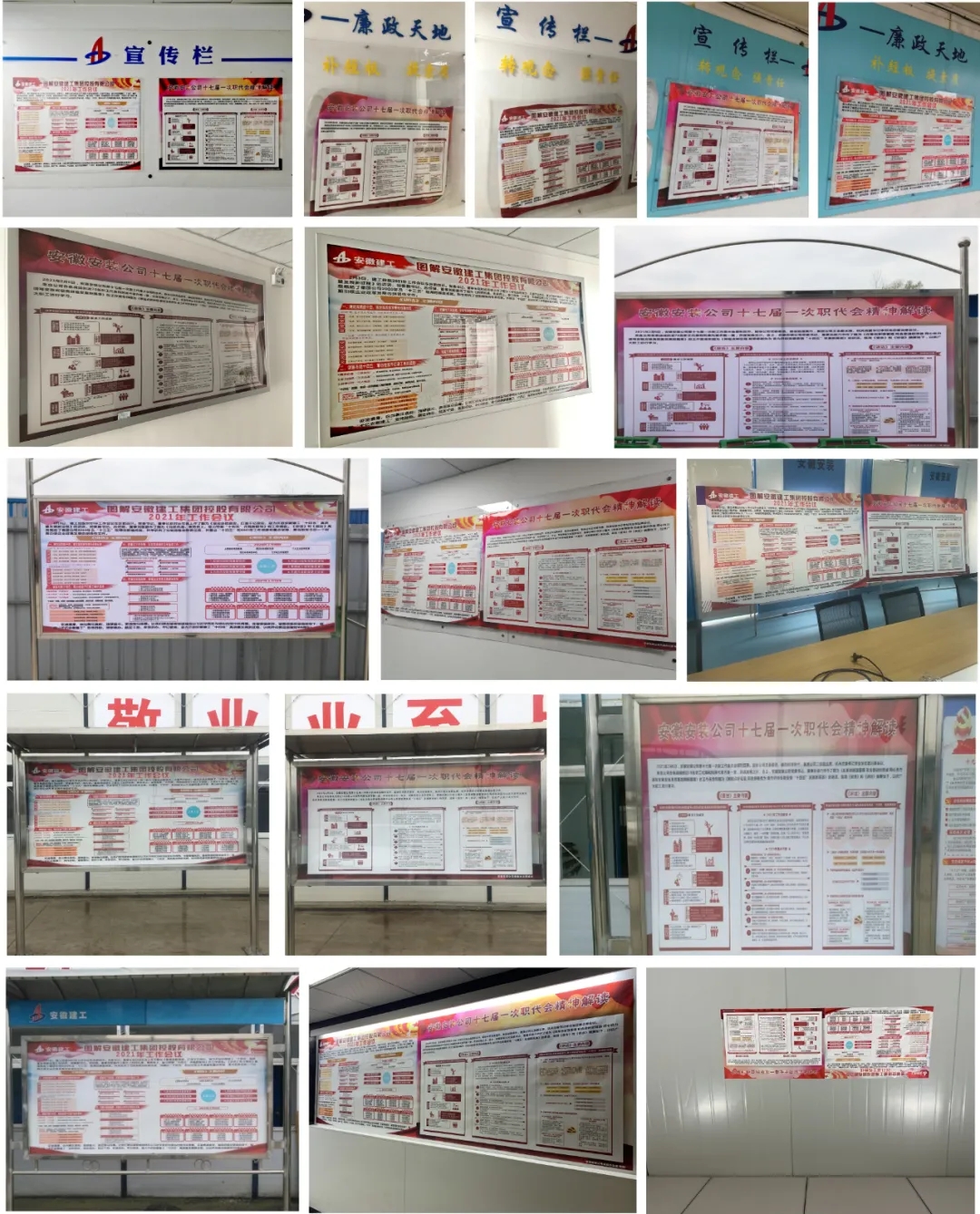二是順勢推進、以點帶面,采取各種方式營造濃厚學(xué)習(xí)氛圍。在兩級會議召開以后,公司黨委辦公室第一時間編印宣傳欄及圖解,并及時發(fā)布在微信公眾號,廣泛宣傳,讓集團工作會議和公司職代會精神人人皆知、入腦入心,進一步凝聚共識、形成合力,夯實思想基礎(chǔ)。年后復(fù)工,立即組織各黨支部在機關(guān)及項目部懸掛張貼宣傳圖、發(fā)放宣傳手冊,掀起學(xué)習(xí)熱潮,營造濃厚氛圍,通過宣傳主陣地形成輿論“正能量”。