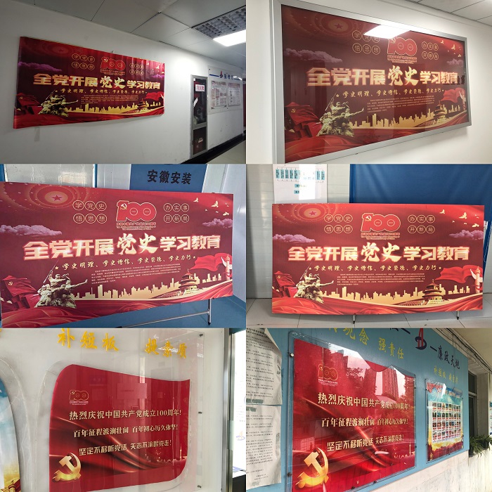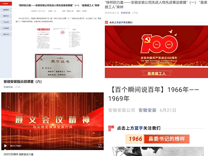 公司黨委第一時間編印??麄靼鍒笙掳l(fā)至所屬各單位和基層項目一線,用好企業(yè)網(wǎng)站、微信公眾號、電子屏、宣傳欄和所屬各單位、各項目部所有宣傳陣地,在公司網(wǎng)站、微信公眾號先后開設“百個瞬間說百年”“黨史學習教育專欄系列報道”“榜樣的力量——安徽安裝公司先進人物先進事跡展播”“記錄奮進力量—安徽安裝公司基層一線事跡展播”等專欄進行專題宣傳,大力營造“學習黨史有熱情,干事創(chuàng)業(yè)有激情”的良好氛圍,合肥分公司黨支部舉辦黨史學習教育主題攝影大賽,努力營造悟初心、守初心、踐初心的強大聲勢。