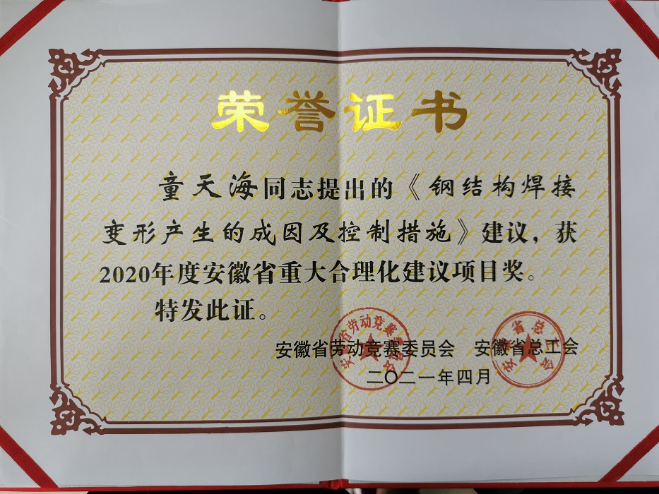 近日,由安徽省勞動競賽委員會和安徽省總工會聯(lián)合評選的“2020年度安徽省重大合理化建議項目獎”揭曉,安徽安裝公司童提出的《鋼結構焊接變形產生的成因及控制措施》成功入選。