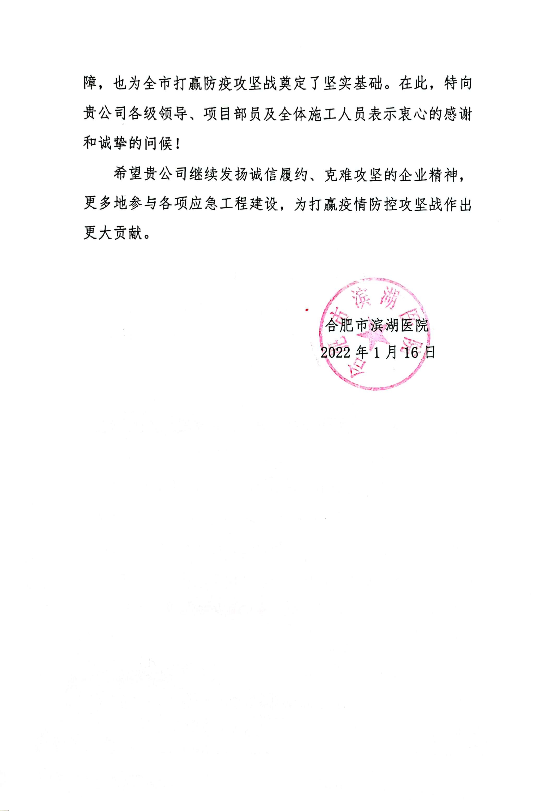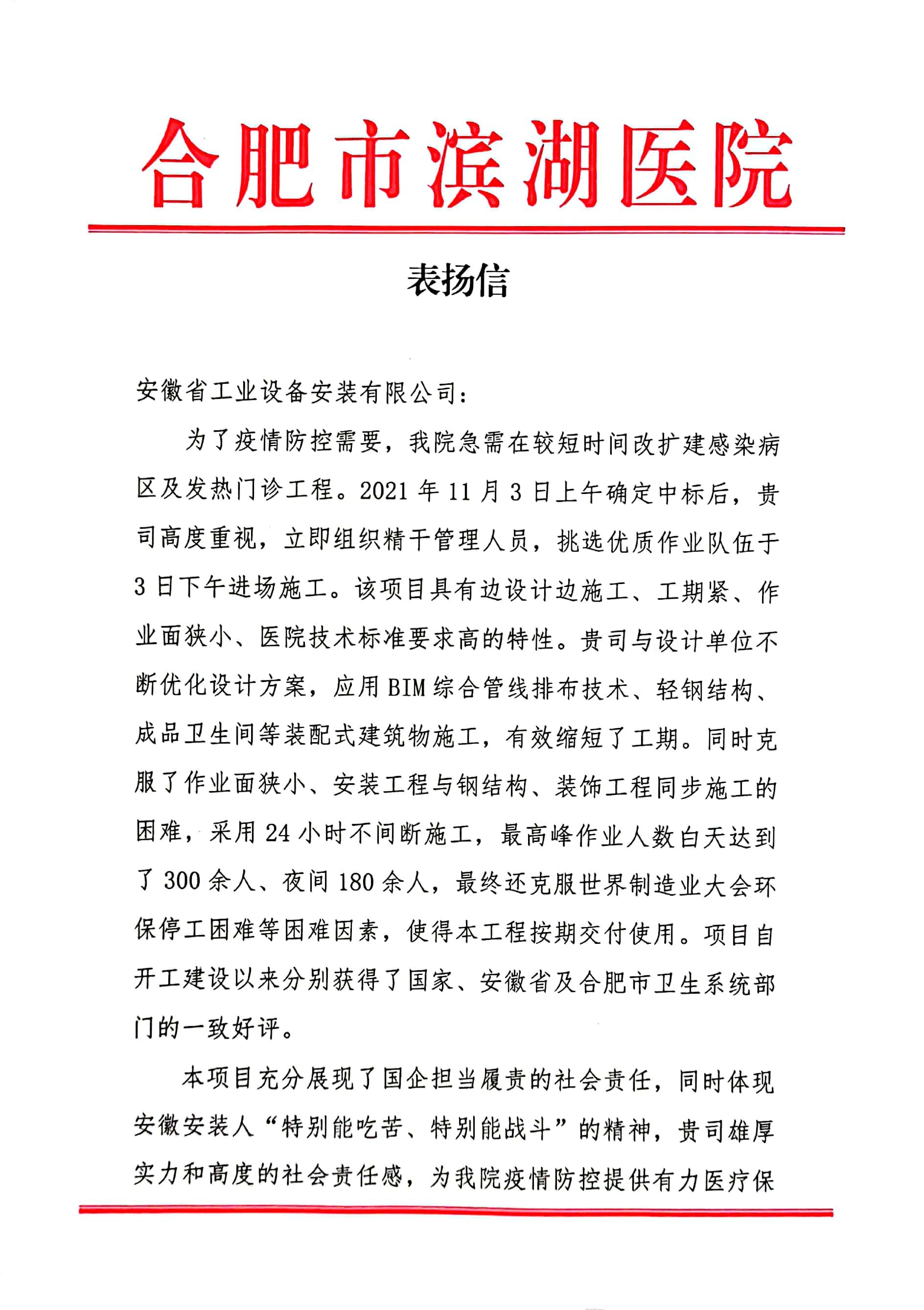 近日,安徽安裝公司收到合肥市濱湖醫(yī)院表揚(yáng)信,信中高度贊揚(yáng)公司濱湖醫(yī)院感染病區(qū)及發(fā)熱門診應(yīng)急改造工程設(shè)計(jì)施工一體化方艙醫(yī)院項(xiàng)目克服重重困難,縮短工期,一個(gè)月的時(shí)間內(nèi)按期交付使用。該項(xiàng)目充分展現(xiàn)了安徽安裝作為國有企業(yè)擔(dān)當(dāng)履責(zé)的社會責(zé)任,為合肥市打贏防疫攻堅(jiān)戰(zhàn)奠定了堅(jiān)實(shí)基礎(chǔ)。