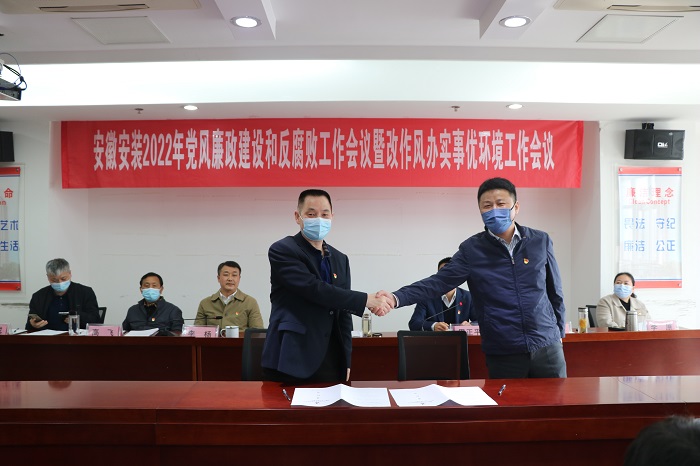 會上傳達學習了習近平總書記在十九屆中央紀委六次全會上的重要講話精神、省紀委十一屆二次全會精神、全省改進工作作風為民辦實事為企優(yōu)環(huán)境大會精神以及集團黨風廉政建設和反腐敗工作暨改作風辦實事優(yōu)環(huán)境工作會議精神,宣讀了《安徽安裝公司改作風、辦實事、優(yōu)環(huán)境工作實施意見》,公司黨委與所屬各黨支部簽訂了《黨風廉政建設責任書》,公司中層管理人員簽訂了《廉潔自律承諾書》。會議以現(xiàn)場加視頻形式召開,公司機關各部門正副職、合肥地區(qū)分公司領導班子成員,外地分公司分別在主、分會場參加會議。