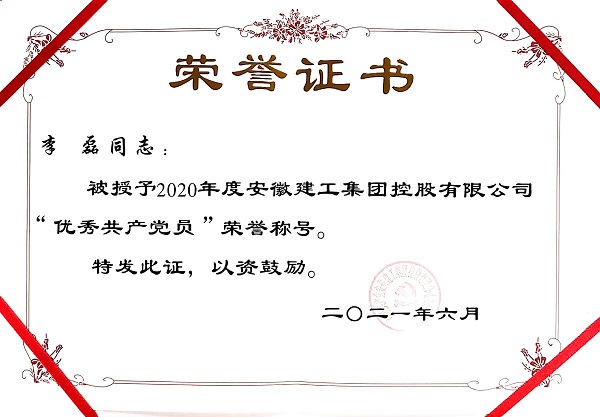 作為一名共產(chǎn)黨員,他處處以黨員的標準嚴格要求自己,聯(lián)系群眾和遵紀守法等各方面都較好的發(fā)揮著共產(chǎn)黨員的先鋒模范作用,得到領(lǐng)導和同事們的一致好評,榮獲2020年度“建工集團年度優(yōu)秀共產(chǎn)黨員”稱號。