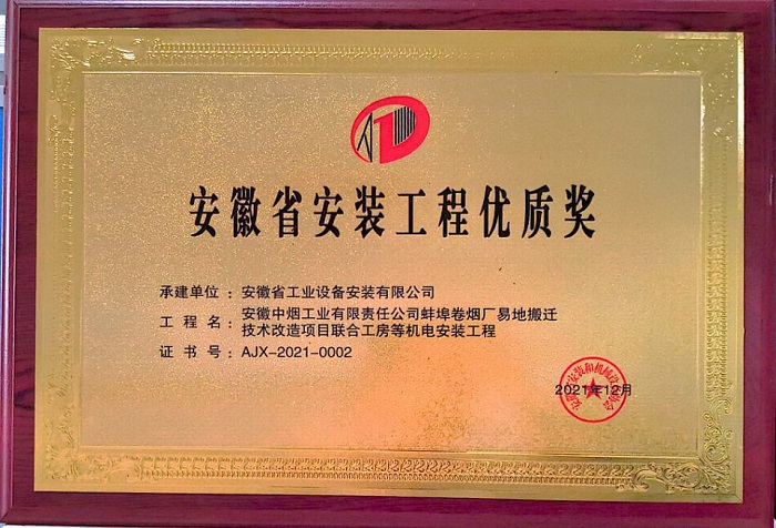 近日,安徽省安裝和機(jī)械設(shè)備協(xié)會第八屆會員代表大會在合肥順利召開,會議頒發(fā)了“2021-2022年安徽省安裝工程優(yōu)質(zhì)獎”,我單位承建的安徽省中煙工業(yè)有限責(zé)任公司蚌埠卷煙廠易地搬遷技術(shù)改造項目聯(lián)合工房等機(jī)電安裝工程、康寧藥用硼硅玻璃管廠房設(shè)施建設(shè)工程(安裝工程)分別榮獲2021年度“安徽省安裝工程優(yōu)質(zhì)獎”、2022年度“安徽省安裝工程優(yōu)質(zhì)獎”榮譽稱號。