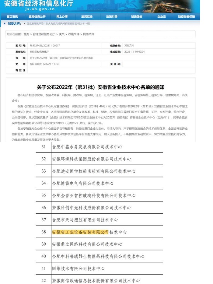近期,經企業(yè)申報,各市經濟和信息化局、發(fā)展改革委、科技局、財政局、稅務局和海關等部門聯(lián)合初審推薦、初評、專家評審、綜合評定、公示等程序,安徽省工業(yè)設備安裝有限公司技術中心順利通過“安徽省省級企業(yè)技術中心”認定。
