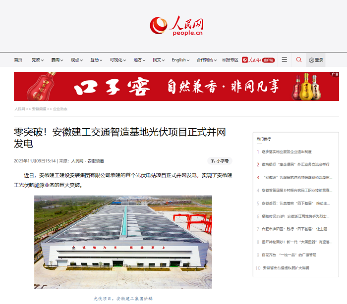 近日,人民網(wǎng)專題報道公司承建的首個光伏電站項目正式并網(wǎng)發(fā)電,實現(xiàn)了安徽建工光伏新能源業(yè)務的巨大突破。