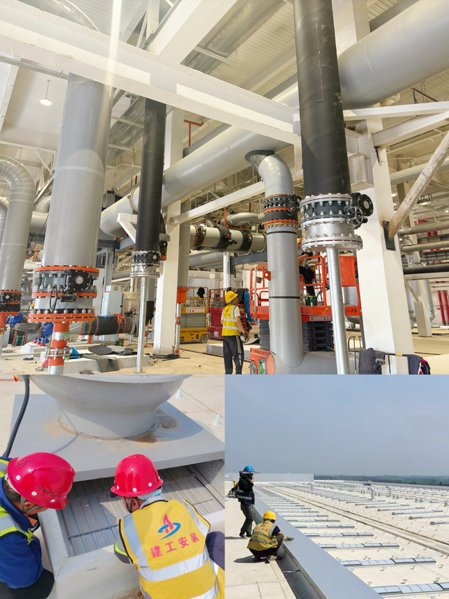 圖為新橋智能制造產(chǎn)業(yè)園項目部冷凍水管道保溫、屋面風機調(diào)試、TPO屋面防雷接地施工