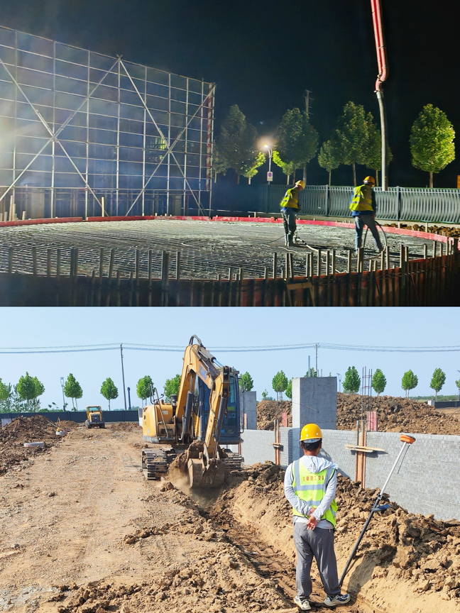 圖為明光科順涂料智能化生產(chǎn)基地項目筏板基礎混凝土澆筑、管道溝槽開挖