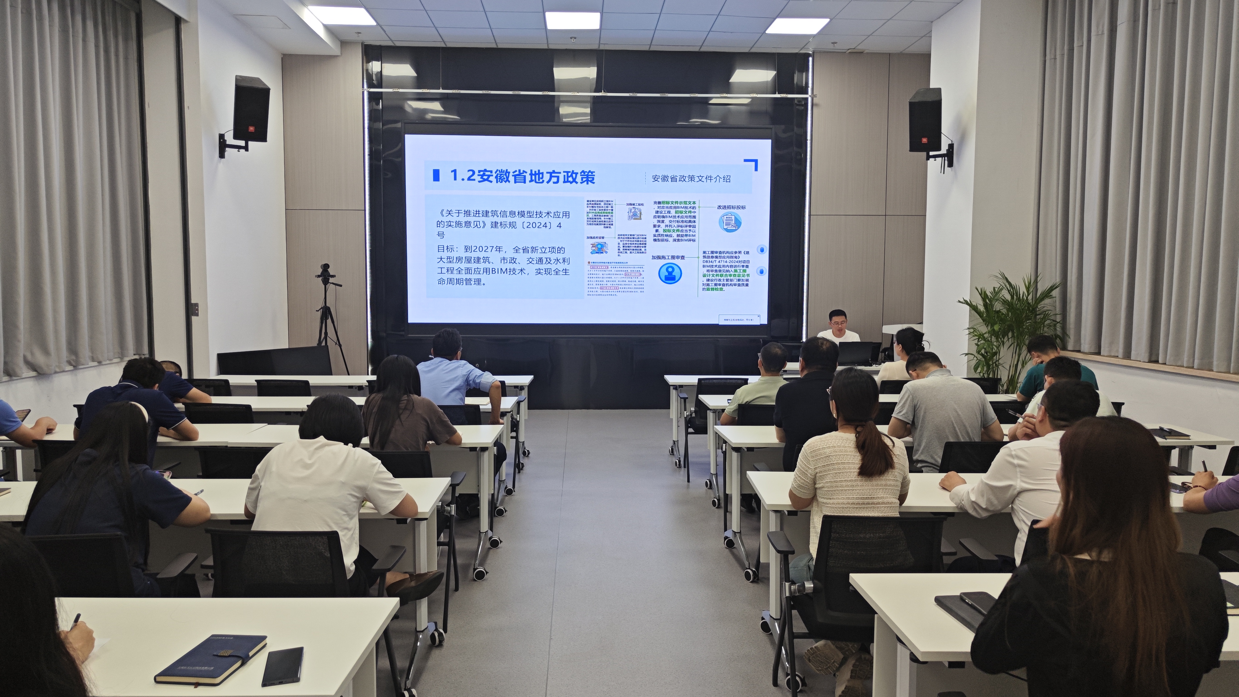 主講人圍繞BIM技術(shù)展開系統(tǒng)講解。梳理國家及安徽省BIM政策要點(diǎn),深度闡釋BIM技術(shù)概念與原理,著重解析其應(yīng)用價(jià)值與優(yōu)勢(shì)。隨后詳細(xì)說明BIM工作流程以及核心技術(shù)應(yīng)用點(diǎn),并借助三個(gè)視頻短片直觀呈現(xiàn)實(shí)際應(yīng)用場(chǎng)景,助力參訓(xùn)人員深化對(duì)BIM技術(shù)的理解。